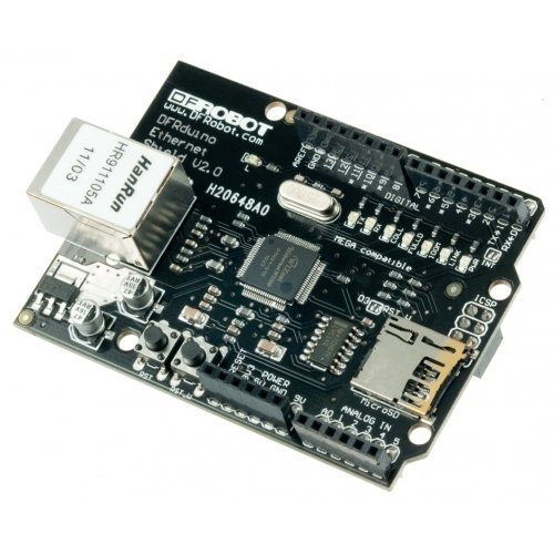 The DFRduino Ethernet Shield V2 is finally released. This new version supports Mega both 1280 and 2560, as well as the Uno and Duemilanove boards. And it supports SD card read/write as well. The ethernet shield is fully assembled.The V2 Ethernet Shield is compatible with Ardunio Ethernet Shield. With the official ethernet library, this Ethernet shield is a very affordable way to get your Arduino projected connected to the network/Internet.The Arduino Ethernet Shield allows an Arduino board to connect to the internet. It is based on the Wiznet W5100 ethernet chip. The Wiznet W5100 provides a network (IP) stack capable of both TCP and UDP. It supports up to four simultaneous socket connections. Use the Ethernet library to write sketches which connect to the internet using the shield.The ethernet shield connects to an Arduino board using long wire-wrap headers which extend through the shield. This keeps the pin layout intact and allows another shield to be stacked on top.Arduino uses digital pins 10, 11, 12, and 13 (SPI) to communicate with the W5100 on the ethernet shield. These pins cannot be used for general i/o.The shield provides a standard RJ45 ethernet jack.The reset button on the shield resets both the W5100 and the Arduino board.The shield contains a number of informational LEDs: * PWR: indicates that the board and shield are powered * LINK: indicates the presence of a network link and flashes when the shield transmits or receives data * FULLD: indicates that the network connection is full duplex * 100M: indicates the presence of a 100 Mb/s network connection (as opposed to 10 Mb/s) * RX: flashes when the shield receives data * TX: flashes when the shield sends data * COLL: flashes when network collisions are detectedAvailable at Amazon